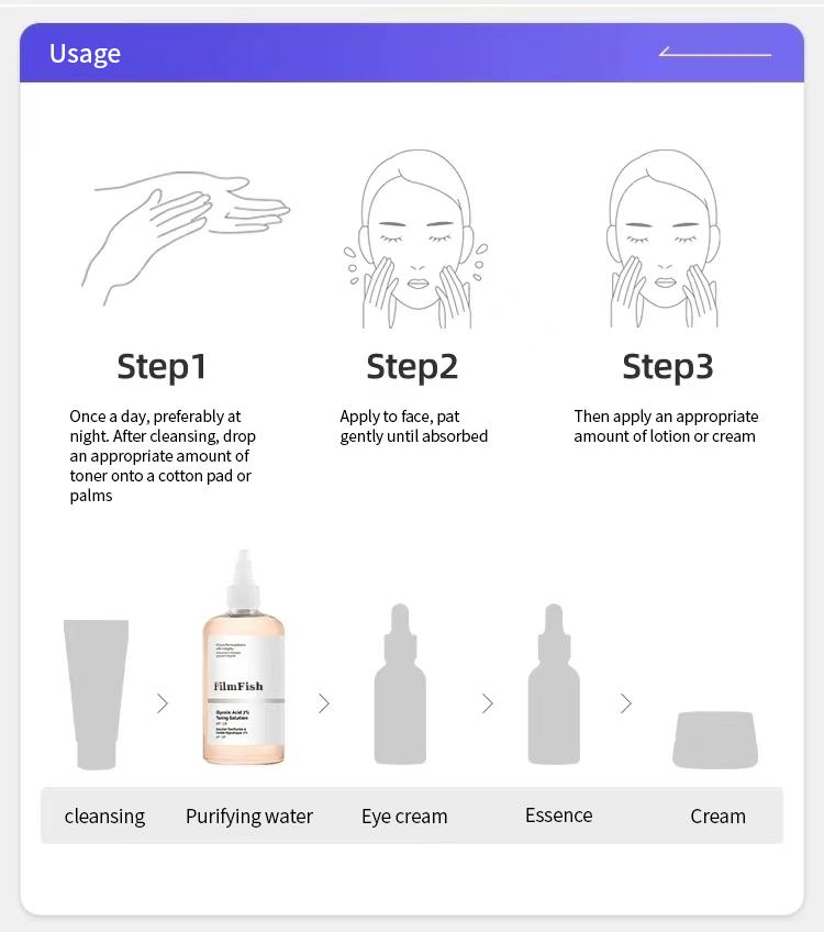 Made by FilmFish, this toner contains glycolic acid as its active ingredient, sourced from China. Suitable for all skin types, this toner comes in a single-item pack of 250g.