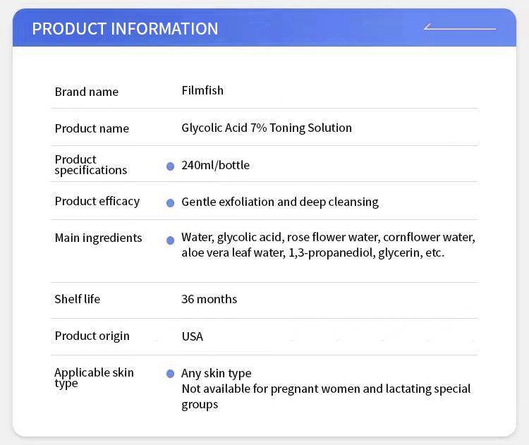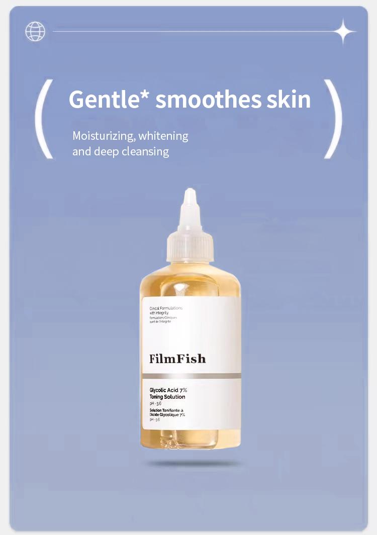 - - Manufacturer: FilmFish- Ingredients: Glycolic Acid- Country of Origin: China - Alcohol/Aerosol: Neither - Pack Type: Single Item - Skin Type: All Skin Types - Net Weight: 250g - Benefits: - Revitalizing - Pore Control - Soothing
